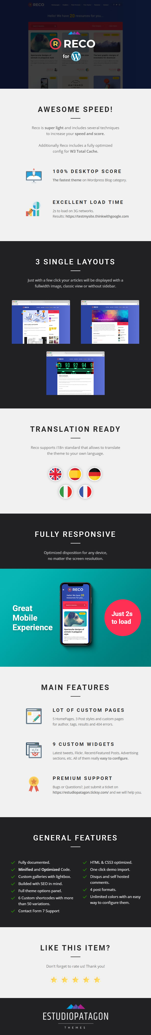 Reco is a theme excellent for magazines, blog, digital freebies, mockups and others. It is super light and was made with multiple techniques to achieve excellent Scores on Google, also we keep in mind the code quality and SEO. This fast theme it is easy to use and customize. Includes 9 customs widgets and a powerful theme options panel to make easier the administration. Reco has AMP and RTL support and it is multilanguage, includes: Turkish, Russian, French, Spanish and English.